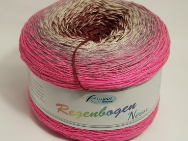 Rellana Regenbogen Neon 200g Bobbel 800 Meter Lauflänge Material: 50% Baumwolle, 50% Polyacryl Nadelstärke: 2,5-3,5 oder nach Anleitung Maschenprobe10 x 10 cm: 25 Maschen 34 Reihen Farbe: 1408 Per Hand gewickelt! Dieses 4fädige Garn besteht jeweils aus 4 Farben pro Farbnummer. Für den wunderschönen Farbverlauf wird nach einem bestimmten Abstand eine neue Farbe angeknotet. Das Garn ist nicht gefacht, sondern gezwirnt, gespliced und knotenfrei.Mit tollem Neoneffekt!