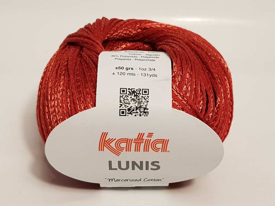 Katia Lunis Material: 54% Baumwolle - 46% Polyamid 50 g Knäuel, Lauflänge:120 Meter Nadelstärke: 4-4,5mm Maschenprobe 10x10cm: 21 MA / 27 R Farbe: 85 Rotorange Eine glänzende Baumwollmischung mit seidiger Oberfläche. Lunis ist die perfekte Wahl für spektakuläre Projekte für Damen wie elegante Tops, Kleider mit Lochmuster und sommerliche Pullis. Außerdem entstehen daraus glitzernde Stolen, glänzende Westen und frühlingshafte Ponchos.