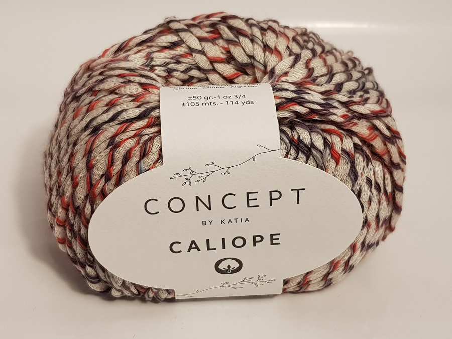 Katia Caliope 50 g Knäuel, Lauflänge:105 Meter Material: 100 % Baumwolle Nadelstärke: 4-4,5mm Maschenprobe 10x10cm: 18 MA/ 20 R Farbe: 63 Rot,Lila,Naturweiß Concept Caliope ist ein originelles Baumwollgarn und besteht aus einem weißen Grundfaden, um den sich bunte Fäden legen. Aus Concept Caliope entstehen außergewöhnliche Tops und jugendliche Pullis. Dieses Garn eignet sich einfach hervorragend für leichte Kleidungsstücke für Frühjahr und Sommer.