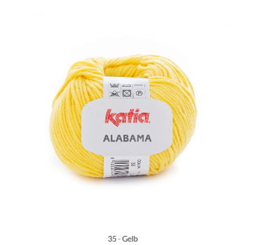 Katia Alabama Material: 50% Baumwolle / 50 % Polyacryl 50 g Knäuel Lauflänge: 105 Meter Nadelstärke: 3,5-4,00 mm Maschenprobe 10x10 cm: 19 Maschen 26 Reihen Farbe: 35 Gelb Ein mattes Garn aus Baumwolle und Polyacryl. Aus Alabama entstehen tolle Kinderpullis sowie Strickjacken für den Übergang. Das Garn ist auch für Amigurumis, gemusterte Kissen und Babydecken sehr gut geeignet.