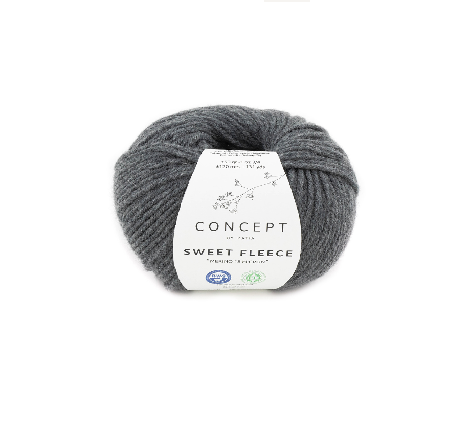 Katia Concept Sweet Fleece Material:Merinowolle aus exklusiven 18 Mikron 80% Schurwolle18 Micron - 20% Polyamid 50 g Knäuel, Lauflänge: 120 Meter Nadelstärke: 4-4,5 mm Maschenprobe 10x10 cm: 17 MA/24 Rh Farbe: 71 Dunkelgrau Sweet Fleece ist ein klassisches, besonders hochwertiges Garn, das aus 18 Mikron dicken Fasern besteht. Es zeichnet sich nicht nur durch seine hohe Qualität aus, sondern trägt zudem das RWS-Siegel (Responsible Wool Standard), das einzige Zertifikat, das im Moment das Wohlergehen der Schafe und der Landschaft, auf der sie gehalten werden, garantiert. Stricke aus dieser exquisiten Schurwolle Pullover, Westen oder einen Rundschal mit Lochmuster auf der Rundstricknadel.