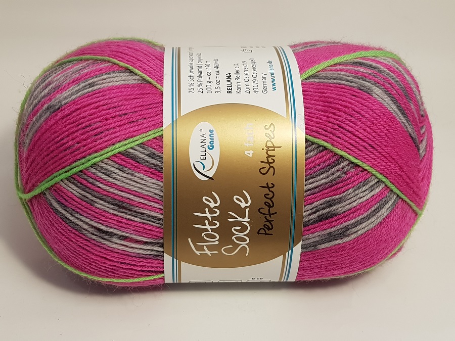Rellana Perfect Stripes / Easy Start Zusammensetzung: 75% Schurwolle superwash, 25% Polyamid Verbrauch: Socken bis Gr. 46 = 100 g Lauflänge: 100 g = ca. 420 m Nadelstärke: 2-3mm Maschenprobe: 10 x 10 cm = 30 M | 42 Farbe: 1173 Grau Pink Sockenwolle, 4fädig. Strapazierfähig, waschmaschinenfest, trocknergeeignet. Die Herkunft der hochwertigen Schurwolle in diesem Garn ist Südamerika und es ist mulesingfrei.