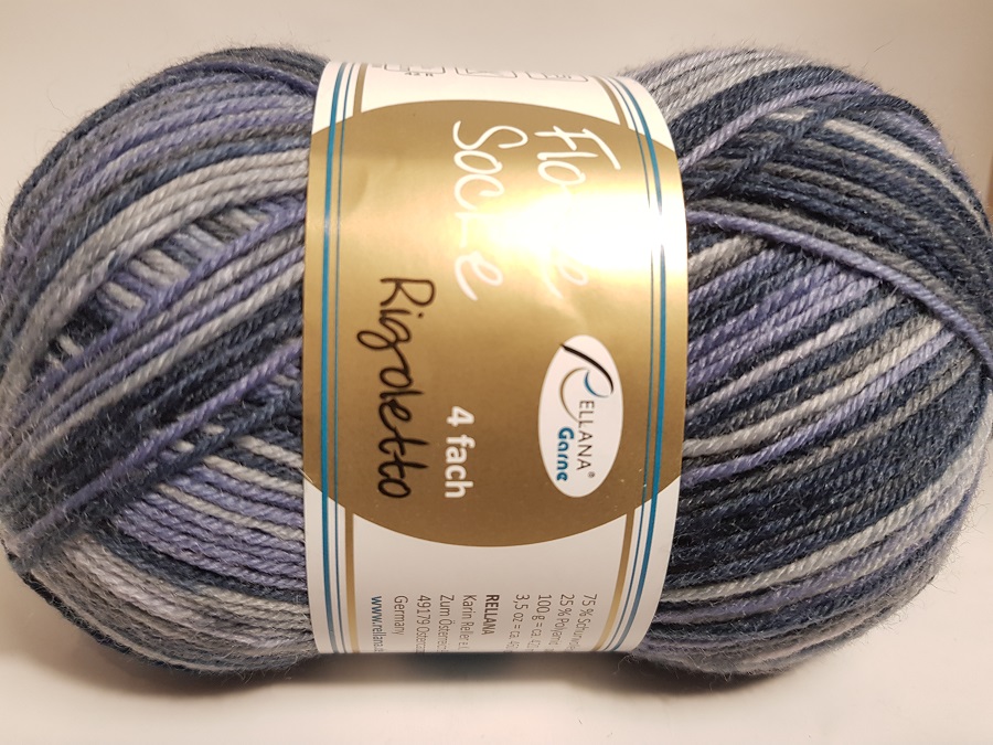 Rellana Flotte Socke Rigoletto Zusammensetzung: 75% Schurwolle superwash, 25% Polyamid Verbrauch: Socken bis Gr. 46 = 100 g Zertifizierung: OEKO-TEX Lauflänge: 100 g = ca. 420 m Nadelstärke : 2-3mm Maschenprobe: 10 x 10 cm = 30 M | 42 R