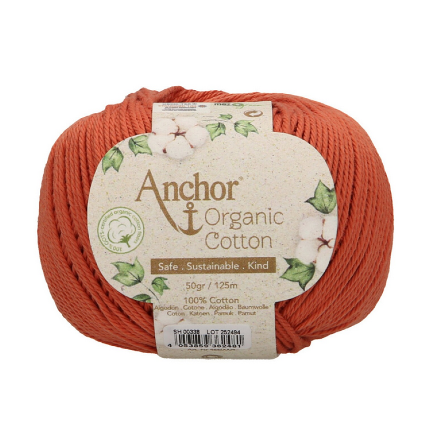 Direkt von den Baumwollfeldern, natürlich, rein und anschließend besonders schonend gefärbt, wird Anchor Organic Cotton aus 100% GOTS-zertifizierten Baumwollfasern in unserer „grünen“ Produktion in Ungarn, unter größtmöglicher Schonung der natürlichen Ressourcen hergestellt. Anchor Organic Cotton wird zu einem nicht mercerisierten 4-fädigen Garn gesponnen, was für einen natürlich weichen Griff und einen matten Effekt sorgt. Frei von Chemikalien und Öko Tex-zertifiziert ist es besonders sicher und sanft für empfindliche Haut. Die Farbpalette enthält 30 wunderschöne, von der Natur inspirierte, Farbtöne. Gefärbt werden die Fasern mit Farbstoffen auf pflanzlicher Basis. Anchor Organic Cotton eignet sich sowohl für Häkel- als auch für Stricktechniken für eine Vielzahl von Projekten, darunter Kleidungsstücke, Accessoires und Wohnaccessoires. Zusammensetzung: 100% Baumwolle, GOTS-zertifiziert Aufmachung: Rundknäuel, Lauflänge ca. 125m / 50g-Knäuel Nadelstärke: 3 - 3,5 mm Maschenprobe (Häkelnadel 3,5mm) 10x10cm: 19M und 24R Maschenprobe (Stricknadel 3mm) 10x10cm: 25M und 32R Farbe:0338 Dunes Red