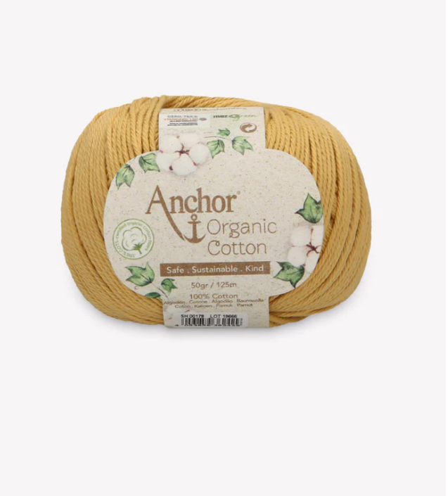 Direkt von den Baumwollfeldern, natürlich, rein und anschließend besonders schonend gefärbt, wird Anchor Organic Cotton aus 100% GOTS-zertifizierten Baumwollfasern in unserer „grünen“ Produktion in Ungarn, unter größtmöglicher Schonung der natürlichen Ressourcen hergestellt. Anchor Organic Cotton wird zu einem nicht mercerisierten 4-fädigen Garn gesponnen, was für einen natürlich weichen Griff und einen matten Effekt sorgt. Frei von Chemikalien und Öko Tex-zertifiziert ist es besonders sicher und sanft für empfindliche Haut. Die Farbpalette enthält 30 wunderschöne, von der Natur inspirierte, Farbtöne. Gefärbt werden die Fasern mit Farbstoffen auf pflanzlicher Basis. Anchor Organic Cotton eignet sich sowohl für Häkel- als auch für Stricktechniken für eine Vielzahl von Projekten, darunter Kleidungsstücke, Accessoires und Wohnaccessoires. Zusammensetzung: 100% Baumwolle, GOTS-zertifiziert Aufmachung: Rundknäuel, Lauflänge ca. 125m / 50g-Knäuel Nadelstärke: 3 - 3,5 mm Maschenprobe (Häkelnadel 3,5mm) 10x10cm: 19M und 24R Maschenprobe (Stricknadel 3mm) 10x10cm: 25M und 32R Farbe:00178 Sunflower