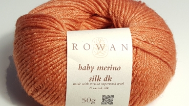 Rowan baby merino silk made with merino superwash wool & tussah silk Made in Italy 50 g Knäuel / Lauflänge: 135 Meter Material: 66 % Wolle / 34 % Seide Nadelstärke: 4,00 mm/US:6 Maschenprobe 10x10cm: 22 Maschen / 30 Reihen Farbe: SH686 Cantaloupe / orange meliert